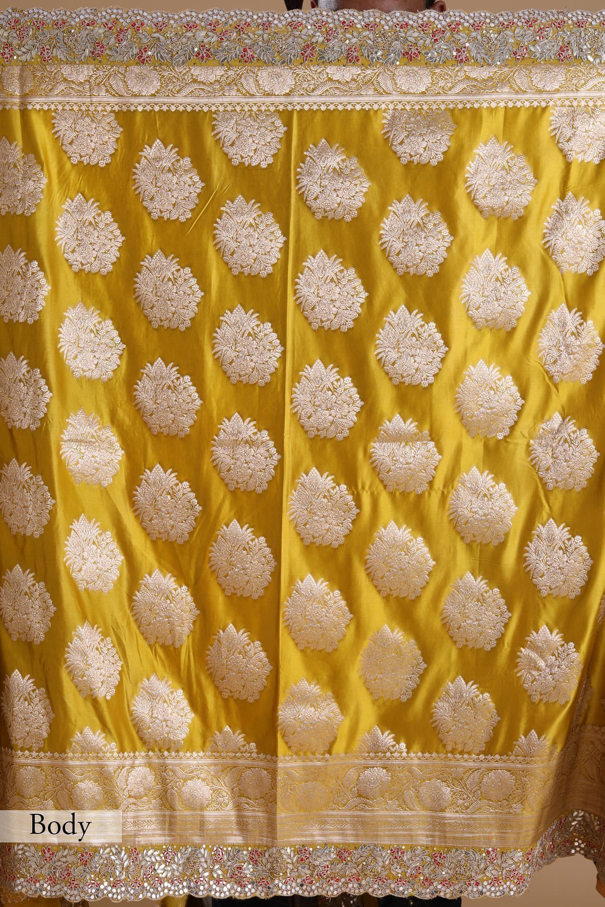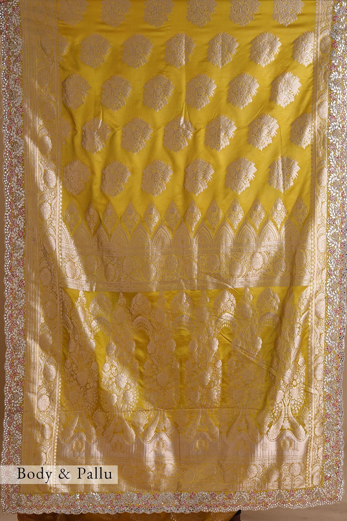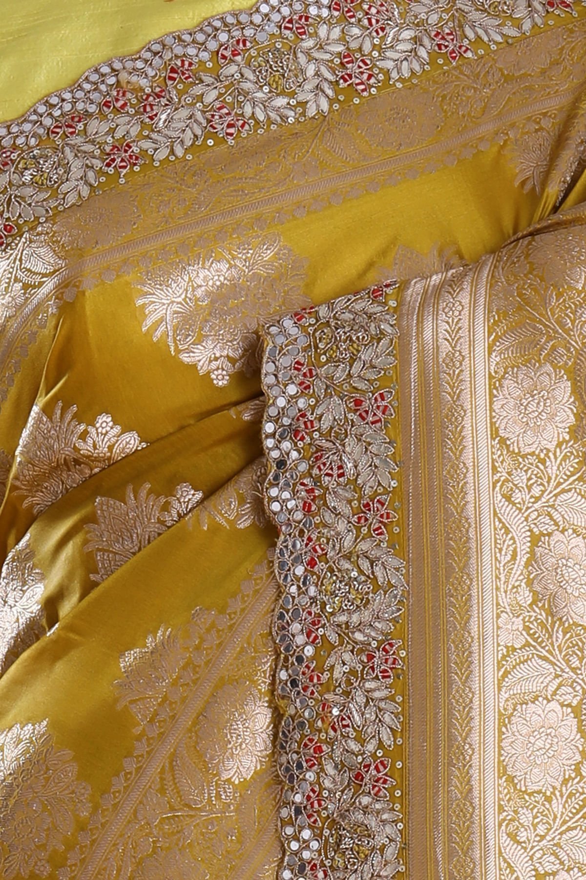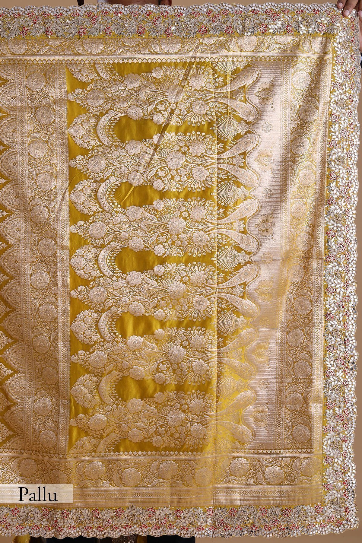 This Antique Moss Yellow Banarasi Silk Saree is a true masterpiece of traditional elegance. The saree boasts intricate Zari woven work all over, creating a luxurious and textured pattern. Its border and pallu are adorned with opulent Gold Silk fabric and detailed with Gota, Dori, Mirror, Resham, Sequins, and Zardosi work, adding a touch of opulence and grandeur. The matching Antique Moss Yellow Blouse complements the saree, featuring Gota and Dori work. This ensemble showcases exceptional craftsmanship and timeless beauty, making it the perfect choice for special occasions, where it is sure to leave a lasting impression. Complete the look by wearing Gold jewelry and bangles. There might be little color variations in the image and original product due to photographic lightings or your monitor settings.