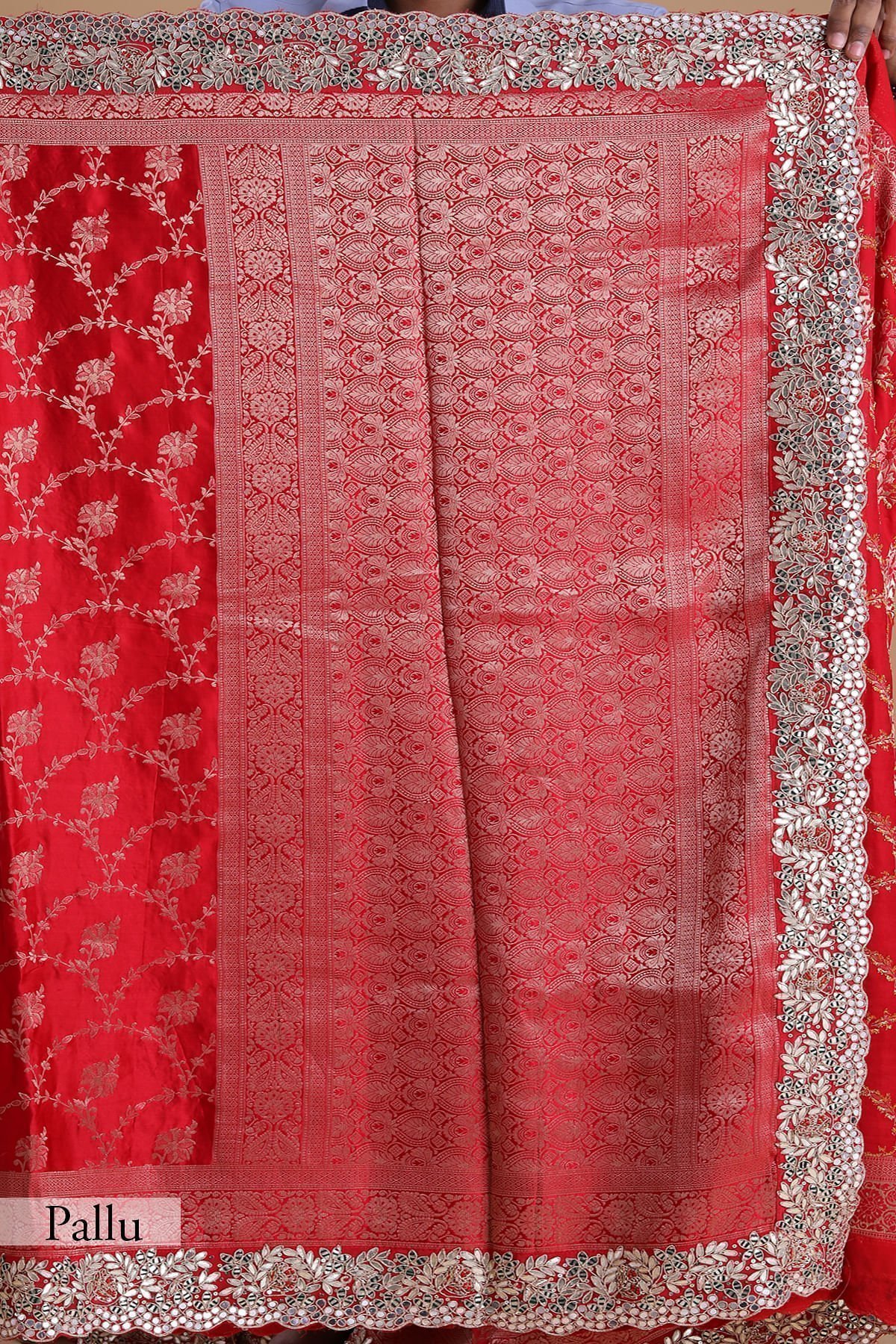 This Crimson Red Satin Silk Saree is a masterpiece of embroidery, with intricate work all over. Crafted from pure satin silk and measuring 5.5 meters, it showcases Zari Woven patterns. The Gold Silk Border is adorned with Gota, Dori, Abla, and Sequins work, enhancing its opulence. The saree’s Pallu features Zari work, while the accompanying unstitched Satin Silk blouse piece (80 cm) complements the ensemble with matching embroidery in Crimson Red, making it a symbol of grace and beauty. There might be a little color variation in the image and original product due to photographic lighting sources or your monitor settings.