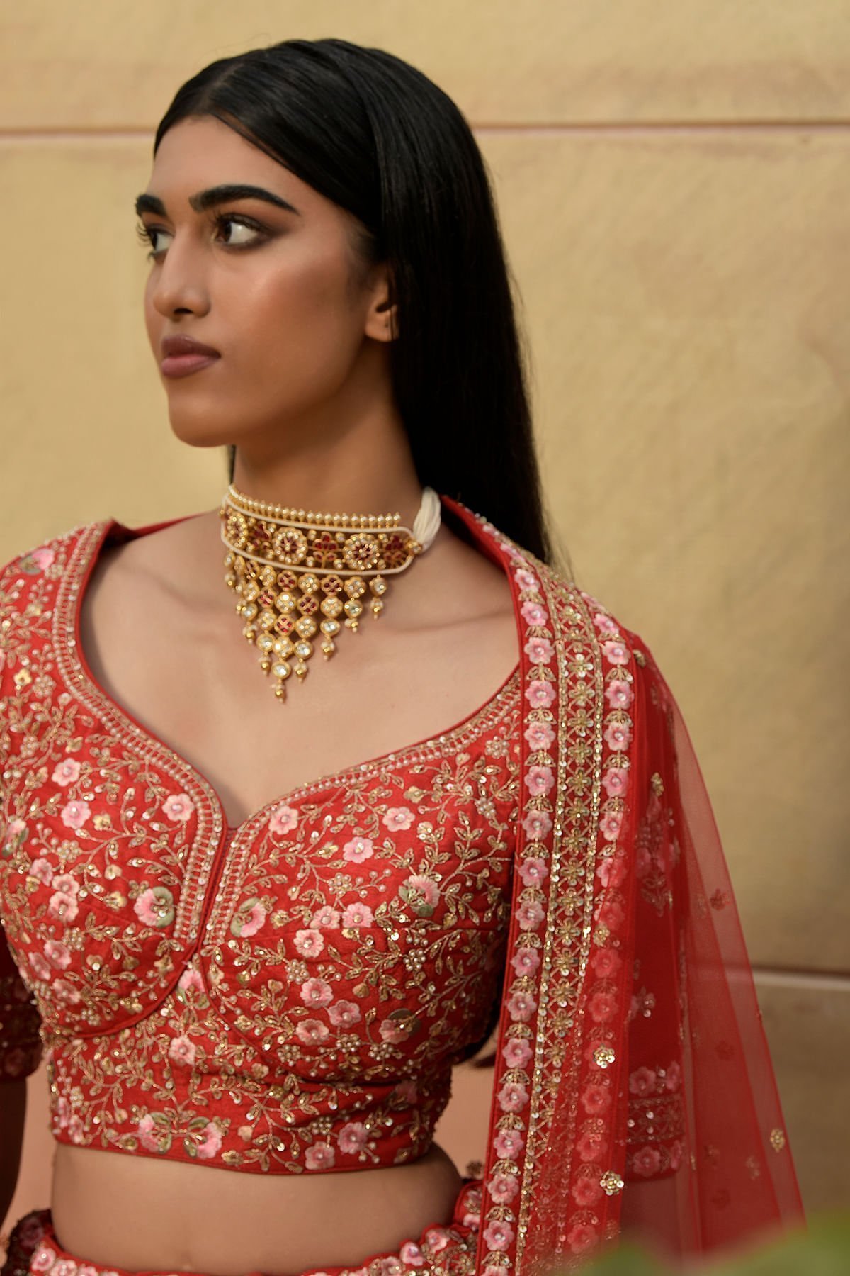 The Persian Red Zari Embroidered Raw Silk Bridal lehenga features intricate zari, resham, mirror, sequins, cutdana, zardosi & pearl work in a linear pattern. Tune yourself with the time to appreciate traditions with net gold border dupatta. Charm yourself in raw silk deep U-neck elbowsleeves choli. There might be a little color variation in the image and original product due to photographic lighting sources or your monitor settings.