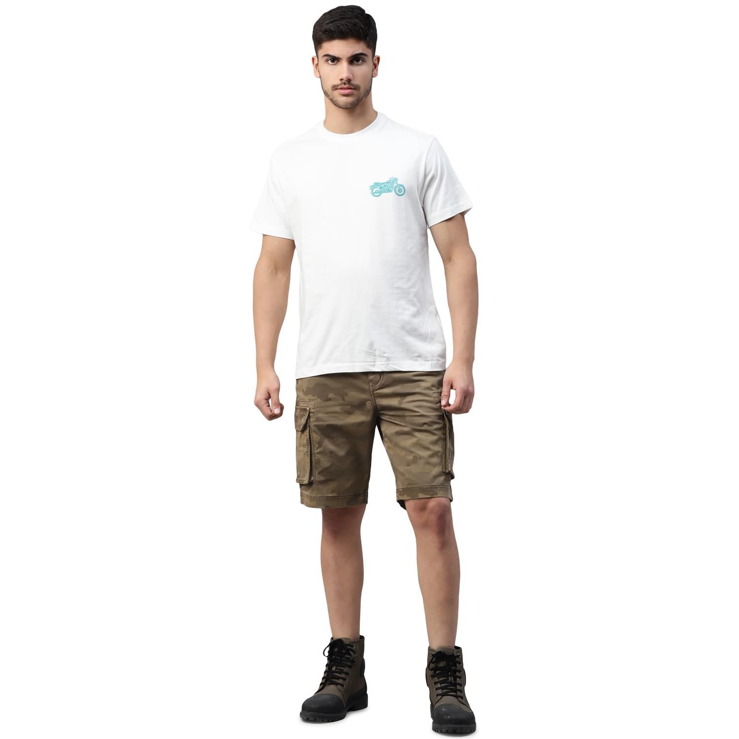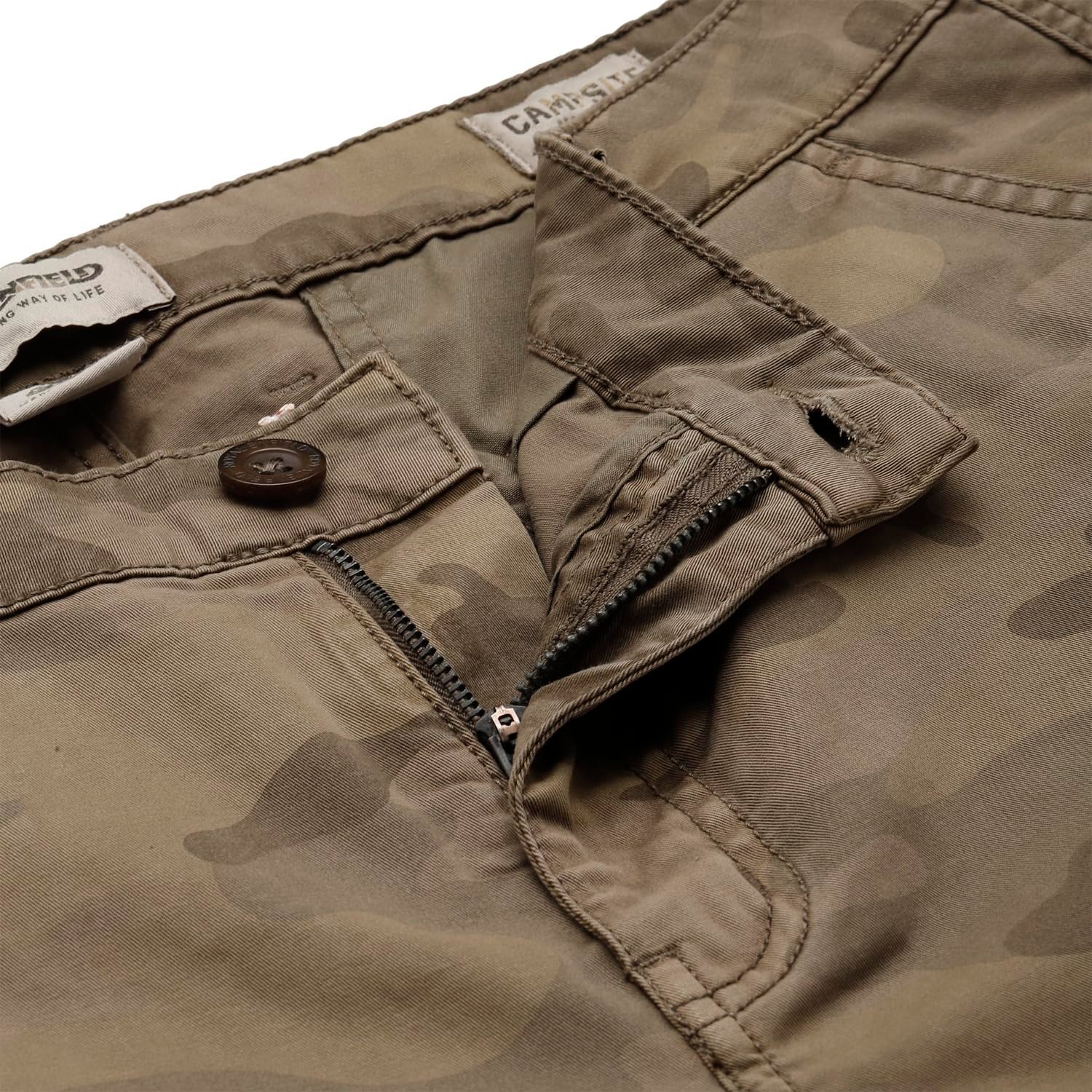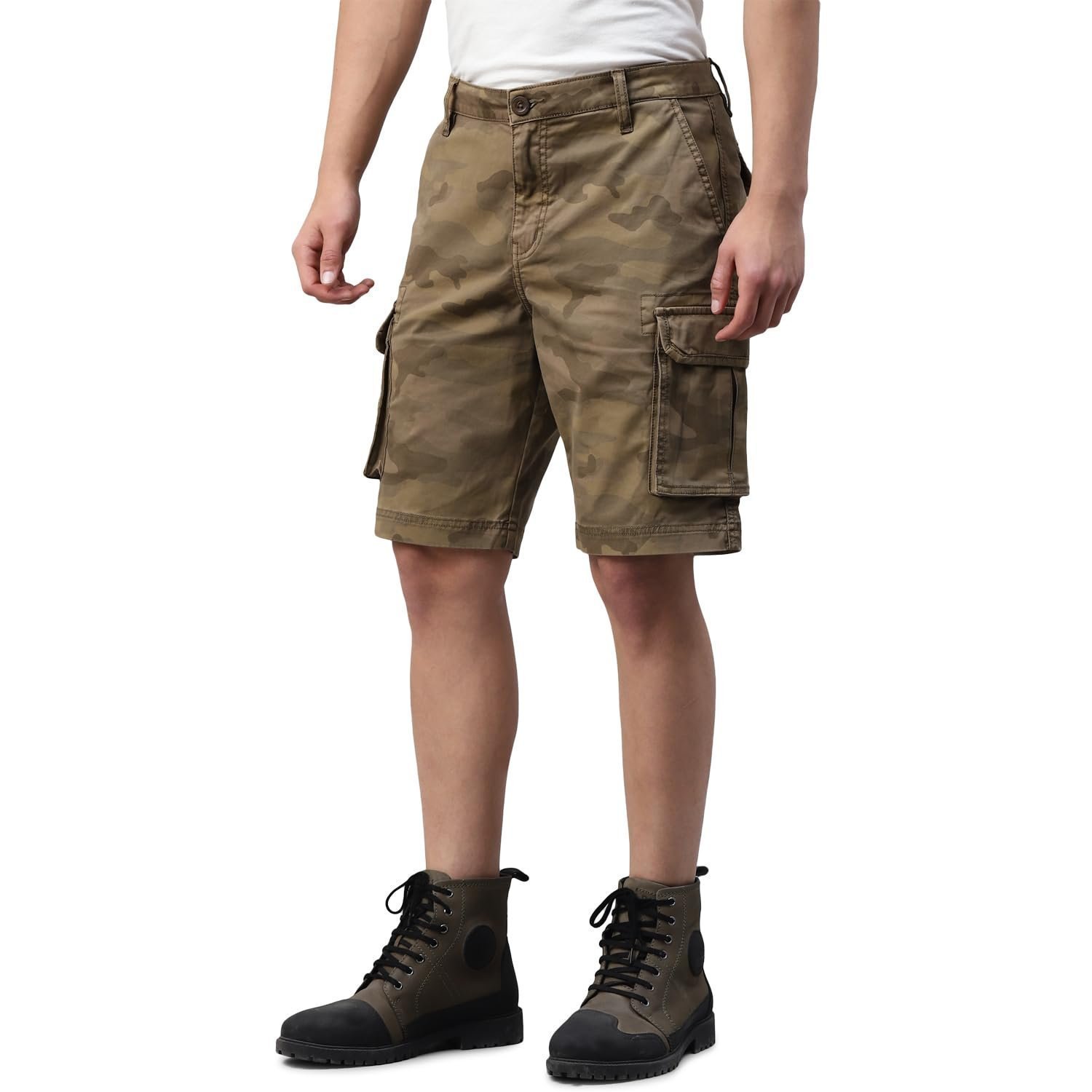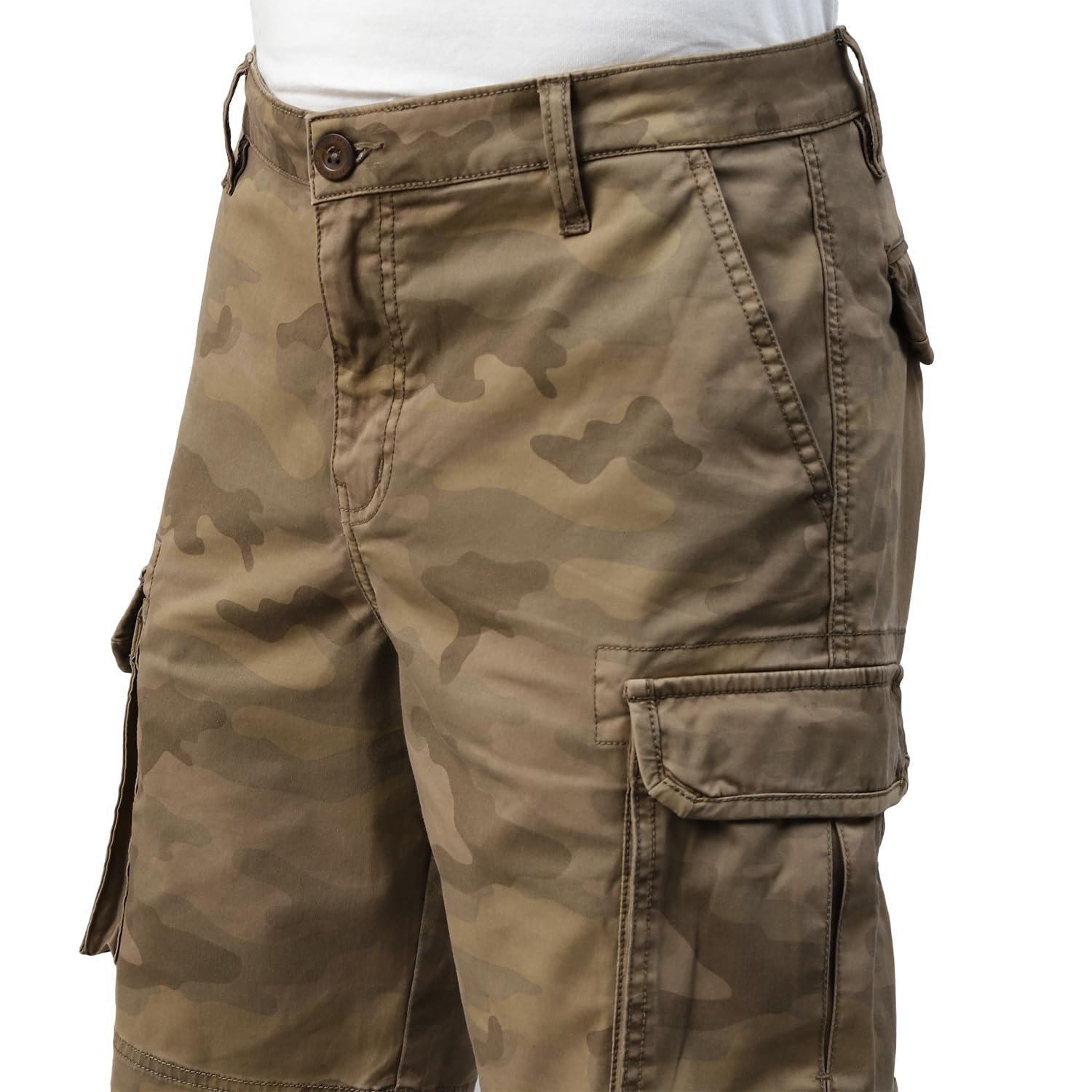 *Material: 99% Cotton+1% Elastane *Fit: Regular * Features a button closure and 6 pockets. *Camo printed – multi pocket cargo shorts